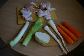 Warzywa dokładnie myjemy i opłukujemy. Opłukujemy również mięso. Do bulionu wystarczą same skrzydełka, ja przy okazji ugotowałem sobie do zjedzenia kilka piersi. Mięso zalewamy w garnku zimną wodą i gotujemy na dużym ogniu aż do zagotowania się wody. Powinno pojawić się wówczas sporo białej, tak zwanej szumowiny (ściętego białka). Zmniejszamy ogień i gotujemy jeszcze przez 2 minuty. Następnie całą wodę wylewamy, dokładnie płuczemy mięso i czyścimy garnek z powstałej piany i osadu. Ponownie zalewamy mięso zimną wodą, dodajemy sól i warzywa. Gotujemy na dużym ogniu aż do zagotowania , po czym zmniejszamy ogień na minimum (tak by rosół się gotował ale nie „bulgotał”) i gotujemy pod przykryciem ok. godziny.