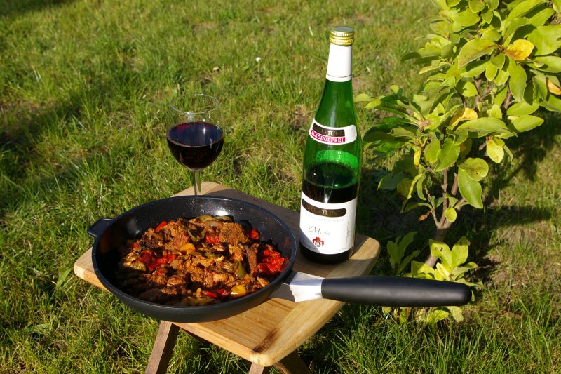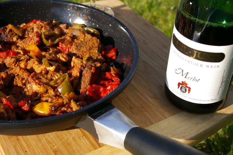 Kolejnym dietetycznym przepisem na Fitness Food jest dziś Pikantny gulasz paprykowy. Ciekawym dodatkiem do tego dania, który odkryłem niedawno na stronach winabezalkoholowe.pl jest wino bezalkoholowe. Wina te poddaje się procesowi dealkoholizacji. Jest to opatentowana metoda, która pozwala wyeliminować z tradycyjnego wina alkohol wraz z jego niekorzystnymi właściwościami, zachowując jednocześnie wszystkie pozostałe cechy trunku, w szczególności jego smak i aromat. Aromat tego czerwonego półwytrawnego, widocznego na zdjęciu wina można umieścić gdzieś pomiędzy delikatnym winem różowym a sokiem wiśniowym lub aroniowym. Jest to z całą pewnością świetne rozwiązanie dla kierowców , np. na imprezach takich jak wesela, kobiet w ciąży bądź też dla osób które z różnych powodów nie mogą spożywać alkoholu.