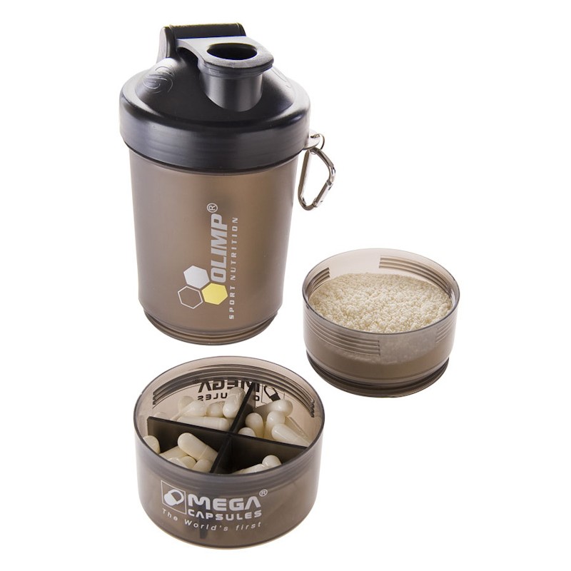 Zadbać o 5-6 pełnowartościowych posiłków w ciągu dnia – to może sprawiać problemy. Nie będzie wielkim grzechem, jeśli od czasu do czasu jeden stały posiłek zastąpimy jego płynną formą, np. białkowo-węglowodanowym szejkiem z łyżką masła orzechowego. Przenoszenie koktajlu w pudełku może skończyć się małą tragedią dlatego tutaj musimy zaopatrzyć się w szejker. Najlepiej taki jak na zdjęciu. Pojemnik główny + 2 dodatkowe „piętra” na kolejną porcję odżywki, masło orzechowe, orzechy, kapsułki czy cokolwiek co tylko będzie nam potrzebne do przygotowania szybkiego, awaryjnego posiłku.
