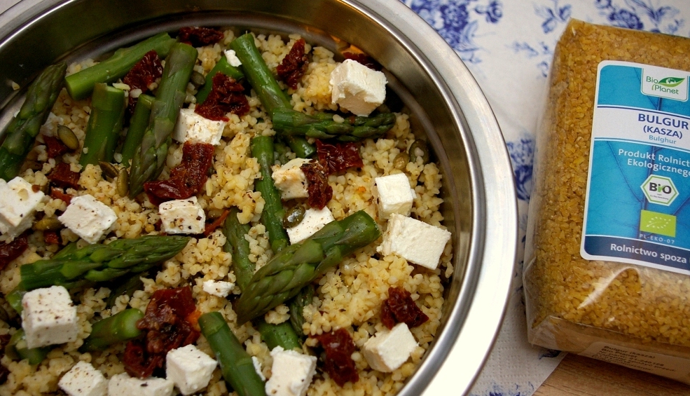 Kasza bulgur z zielonymi szparagami, fetą i suszonymi pomidorami