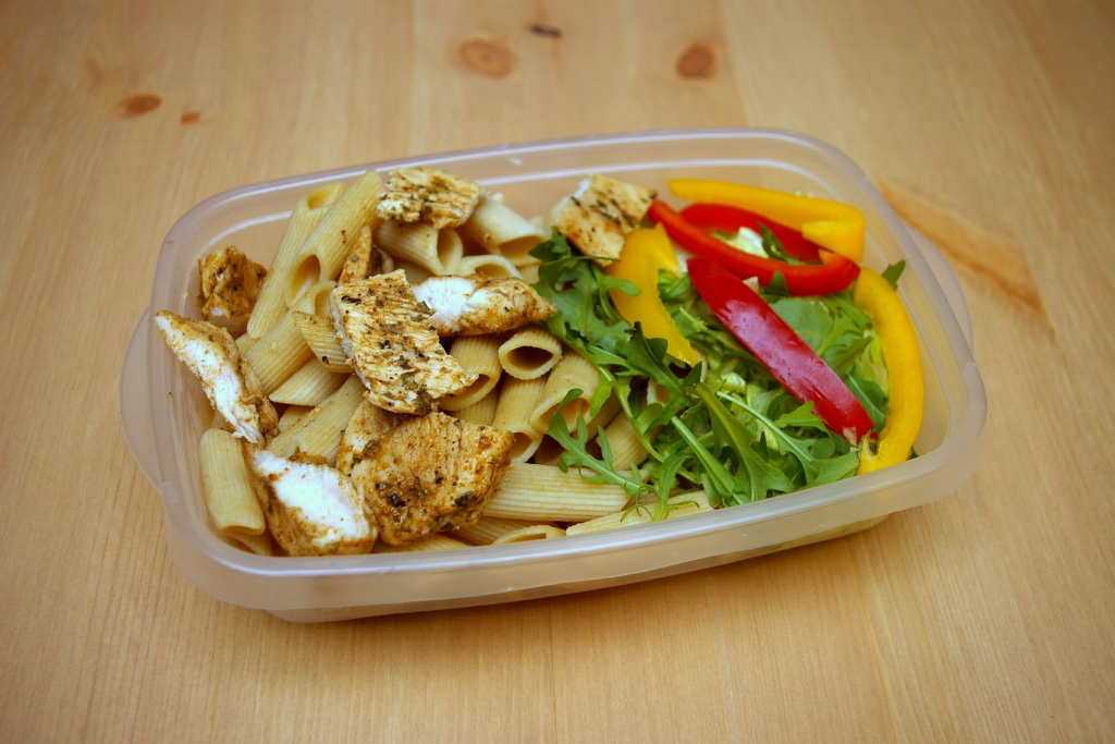 Bezpośrednio po powrocie do domu spożywam właściwy posiłek po treningowy. Przygotowuję go dzień wcześniej i w tym przypadku był znów makaron oraz kurczak + najprosztsza sałatka z pomidora, ogórka i sałaty. Do tego mała puszka coli zero i to właśnie był ostatni tego dnia stały posiłek.