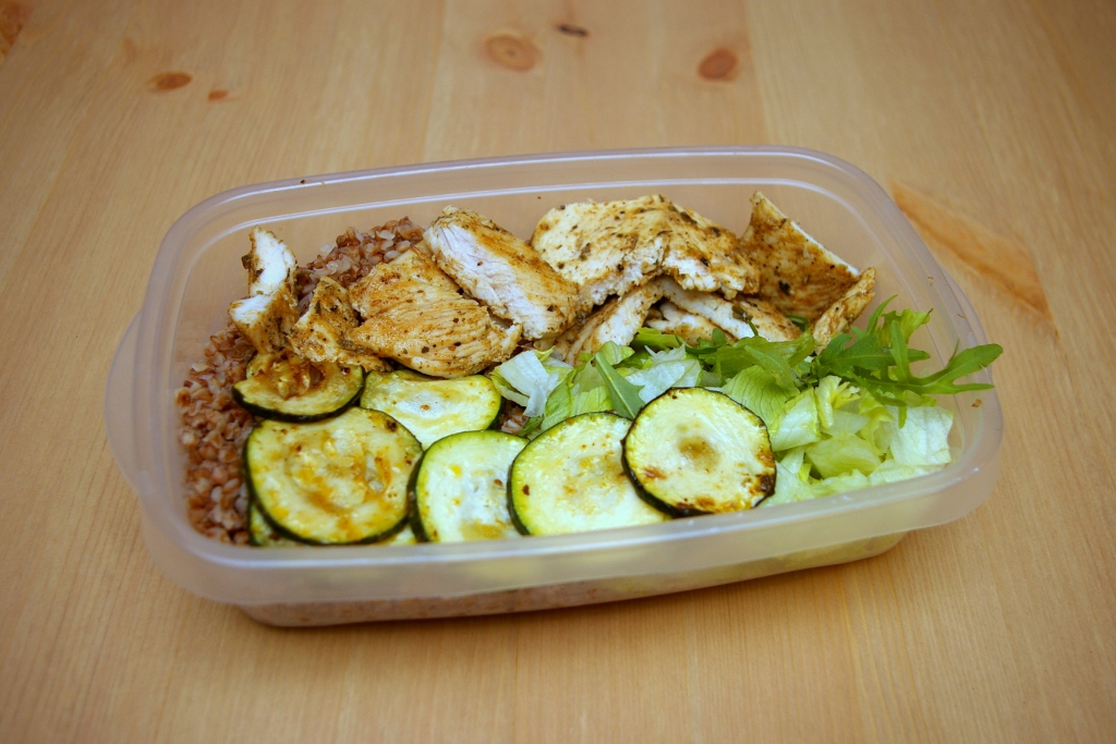 Trzy godziny później, również w pracy przychodzi pora na trzeci posiłek. Tutaj znów pierś z kurczaka ale już nieco inne źródło węglowodanów czyli moja ulubiona – kasza gryczana palona. Do tego warzywa, w tym przypadku grillowana razem z kurczakiem cukinia i trochę sałaty lodowej oraz rukoli. Jako źródło tłuszczu w tym posiłku trafił się olej lniany. Niezbyt smaczny ale jeśli chodzi o wartości to jeden z najlepszych. Jak widzicie w tabelach wartości odżywczych (źródło: potreningu.pl), moje posiłki mają bardzo podobny rozkład B/T/W, czyli dla posiłków nr 2, 3 i 4 jest to mniej więcej 40g białka, 70g węgli i 15g tłuszczów. Natomiast w posiłku po treningowym staram się raczej unikać tłuszczów ale B i W pozostają znów na podobnym poziomie.