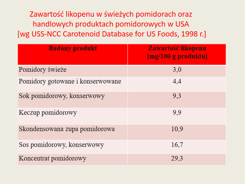 Likopen znajdziemy nie tylko w świeżych pomidorach, Zauważono, że jest on stabilną, rozpuszczalną w tłuszczach substancją, której najwyższą zawartość znajdziemy w przetworach pomidorowych. Spójrzmy na tabelę poniżej.