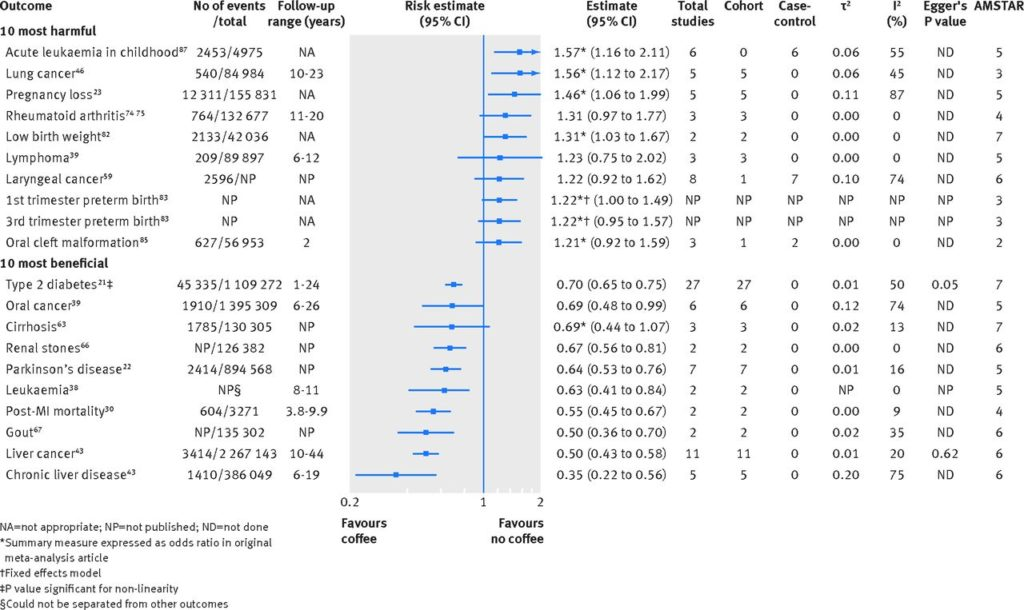 Bezpieczne dawki kofeiny zawartej w kawie nie wyczerpują tematu zdrowia. Podjęto wiele eksperymentów i badań pod kątem profilaktyki zdrowotnej, wpływie kawy na poszczególne organy, hormony i kondycję psychofizyczną człowieka. Wszystko po to, by odpowiedzieć na pytanie – czy kawa jest szkodliwa i jeśli jest, to dla kogo, w jakich warunkach czy może nie jest i każdy może przeciwnie – można spożywać bez jakichkolwiek konsekwencji. Już po pierwszej analizie kofeiny widzimy, że ze względu na odmienny metabolizm kawa nie jest wskazana dla wszystkich. Przyjrzyjmy się na samym początku ogólnym wnioskom z 218 metaanaliz dot. spożycia kawy [25].