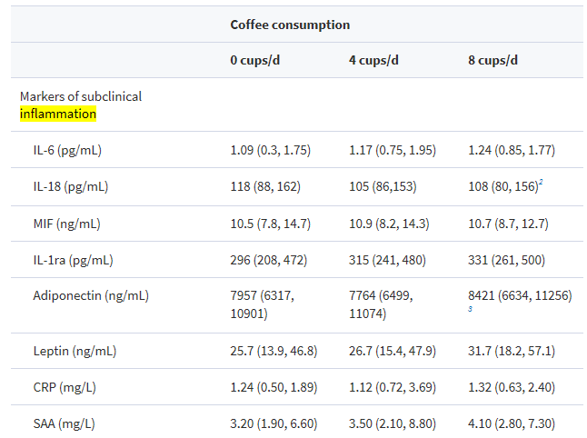 Wszystkie te badania przeprowadzone zostały na zdrowych osobach. Z tego wniosek, że konsumpcja kawy może zwiększać produkcję niektórych cytokin prozapalnych. Nie jest to pozytywna informacja [30]. Z drugiej strony temat nadal jest otwarty, bowiem kawa zawiera antyoksydanty, czyli substancje przeciwzapalne. Chociaż w innym badaniu [31] zauważono zróżnicowane działanie kawy na poziomy interleukin przy wysokim spożyciu kawy (tabela poniżej [31]), to warto zachować zdrowy rozsądek. W świetle przeprowadzonych badań nie ma jednoznacznego wniosku.